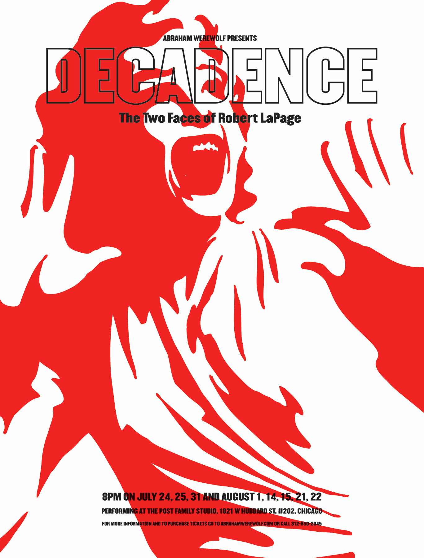 DECADENCE is an examination of the empty glamour of 1970s Hollywood imbued with the spirit of the Parisian Grand Guignol theatre. The production employs la douche ecossaise ("the hot and cold shower"), a theatre style which alternates comedic and macabre vignettes reflecting upon such unsavory themes as sexual violence, insanity, revenge and cold-blooded murder. With the rise in the divorce rate, a "pulling back" from the liberal nature of the 1960s, the end of the Vietnam war, and the birth of the serial killer, the 1970s provide an especially fertile ground for exploration.