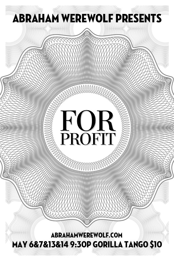 Theatre is no longer the language of dissent. In fact, it has always been a contract of manipulation: the suspension of disbelief. What else can be suspended? Morals? Judgement? Willpower? Abraham Werewolf begins its 2011 season with FOR PROFIT, a unique theatrical experience which presents a view of the artistic process in a funhouse mirror.