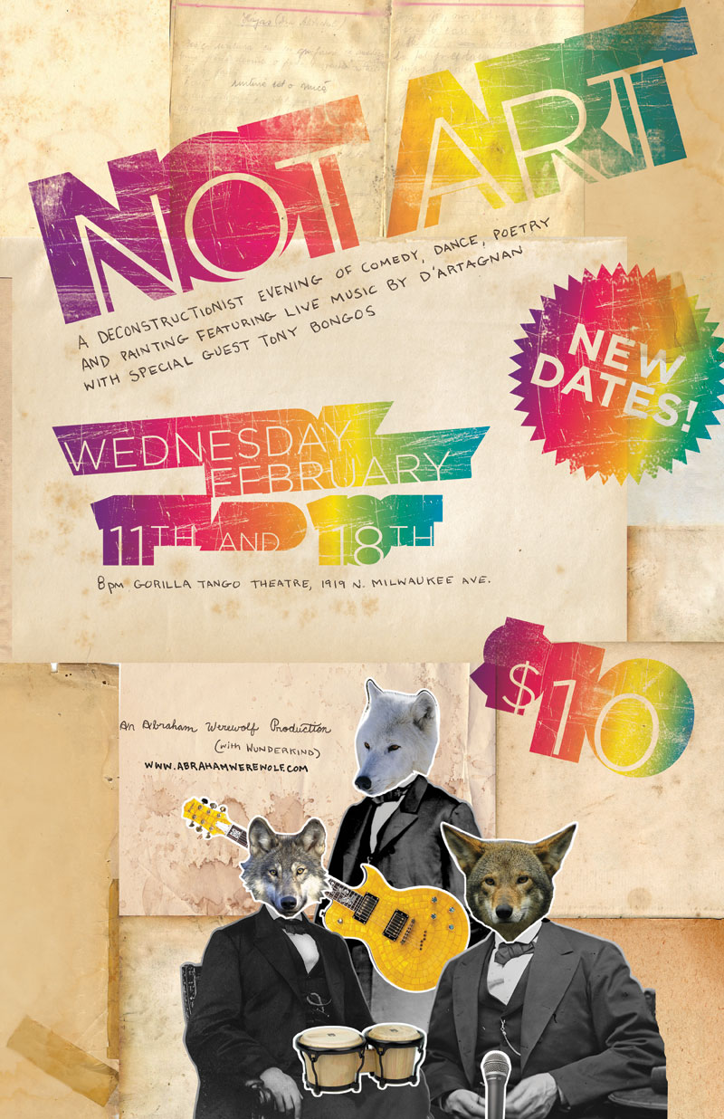 NOT ART is a comedic study of the working relationship between the members of D'Artagnan, a touring rock band from Chicago. When Tony (lead bongos) brings a new mode of expression to his bandmates, Billy (lead singer) refuses to accommodate the new sound. Joey (lead guitarist) is caught in the middle of their intellectual battle as he looks down the barrel of his shotgun wedding.